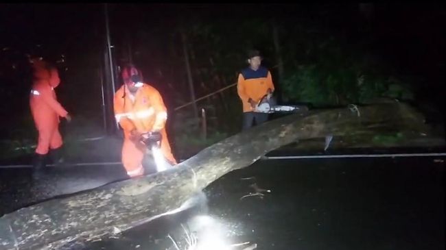 Hujan deras yang berlangsung selama lebih 3 jam memicu terjadinya pohon tumbang di ruas jalan nasional Jumat (19/1/2024) dini hari. Proses evakuasi membutuhkan waktu satu jam.
