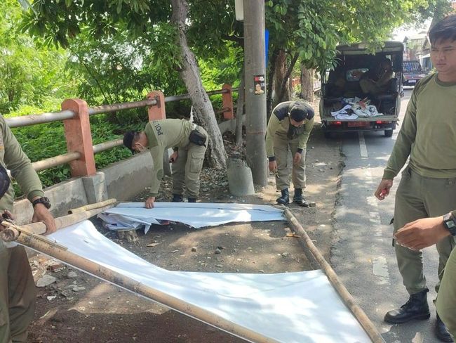 Puluhan baliho berukuran besar dengan kondisi doyong diturunkan Satpol PP Surabaya. Ini dilakukan lantaran membahayakan pengguna jalan, apalagi saat musim hujan.