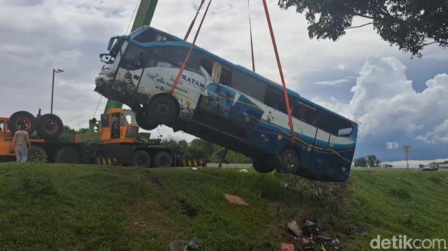 "Jadi truk muat rambutan itu sudah terguling posisinya malang (melintang). Bus nomor 3 ini kecepatan 100 km/jam, jadi tidak bisa menghindari nabrak bak truknya itu terus keluar tol itu," katanya.