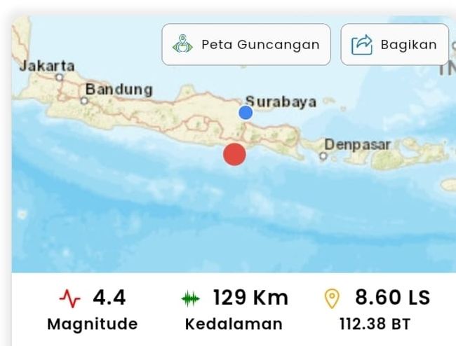 Gempa M 4,4 mengguncang wilayah Malang. Gempa bumi berpusat di 48 km Barat Daya Kabupaten Malang, Jawa Timur.