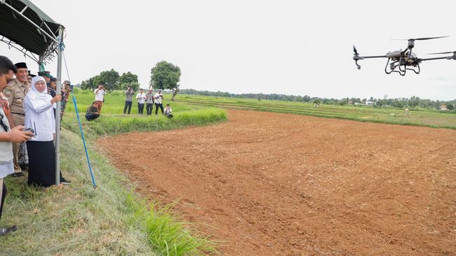 Gubernur Jawa Timur Khofifah Indar Parawansa menanam kedelai menggunakan drone di lahan seluas 3,5 hektare di Desa Dlemer, Kecamatan Arosbaya, Kabupaten Bangkalan. Drone penanam kedelai ini merupakan harapan baru di sektor pertanian.