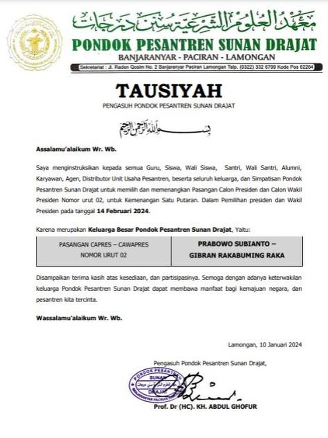 "Saya menginstruksikan kepada semua Guru, Siswa, Wali Siswa, Santri, Wali Santri, Alumni, Karyawan, Agen, Distributor Unit Usaha Pesantren, beserta seluruh keluarga, dan Simpatisan Pondok Pesantren Sunan Drajat untuk memilih dan memenangkan Pasangan Calon Presiden dan Calon Wakil Presiden Nomor urut 02, untuk Kemenangan Satu Putaran. Dalam Pemilihan presiden dan Wakil Presiden pada tanggal 14 Februari 2024. Karena merupakan Keluarga Besar Pondok Pesantren Sunan Drajat,"