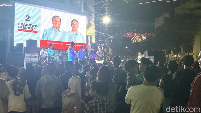 Relawan Prabowo-Gibran BerKharisma Jatim semarakkan Jalan Tunjungan, Surabaya pada Sabtu (27/1/2024) malam. Relawan BerKharisma menggelar konser musik dadakan yang diisi musisi dan DJ lokal Surabaya.