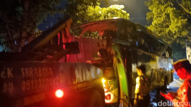 Di saat bersamaan dari arah sebaliknya melaju dump truk tronton bernopol L 9310 UU. Karena terlalu dekat bus tersebut menabrak truk yang dikemudikan Adi (50) warga Bojonegoro.