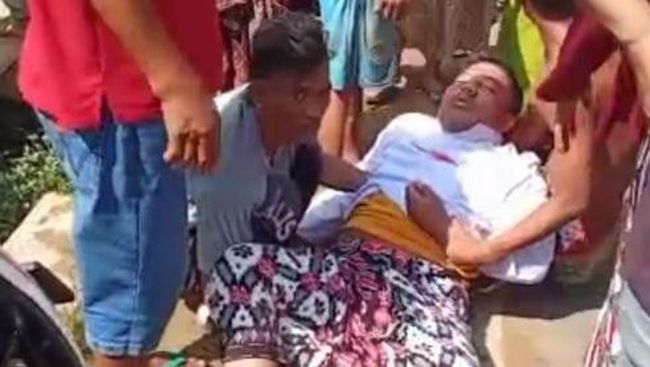Terlihat pengendara pikap yang memakai baju putih dan sarung terluka di pinggir jalan. Warga tampak mengerumuninya. Sedangkan korban lainnya terlihat merintih sembari memegangi kakinya yang mengucurkan darah.