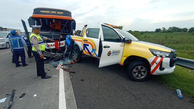Kecelakaan lalu lintas terjadi di Tol Sumo KM 722+400 jalur B Tol Surabaya - Mojokerto. Sebuah Bus Bagong menabrak dari belakang mobil Jasa Marga.