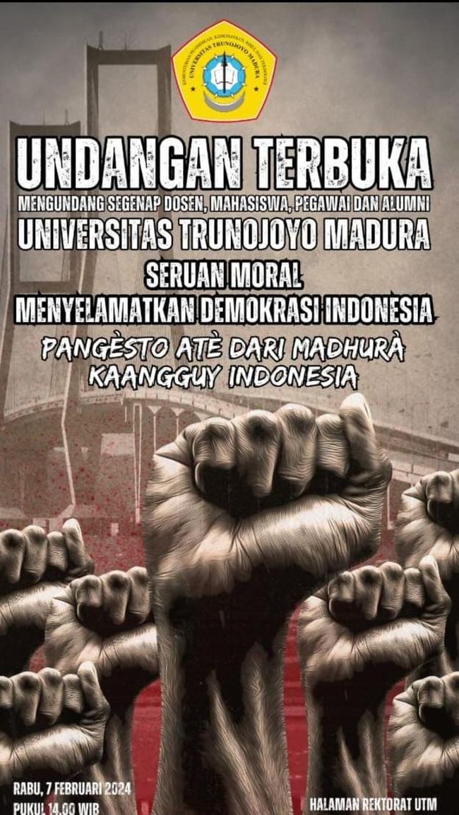 Pengamat Politik UTM Surokim Abdussalam yang juga menjabat sebagai Wakil Rektor Bidang Kemahasiswaan membenarkan aksi seruan moral menyelamatkan demokrasi Indonesia. Ia menyebut, aksi ini akan digelar di halaman rektorat UTM pada Rabu (7/2) pukul 14.00 WIB.