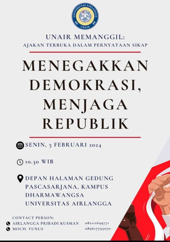"Bukan acara sekolah pascasarjana Unair. Soal acara tersebut dapat konfirmasi dari akademisi yang tercantum di poster sebelah kiri yang tercantum nama Mas Airlangga Pribadi," kata Prof Suparto dalam keterangannya, Minggu (4/2/2024).