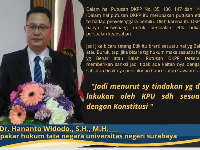 Ketua KPU sebagai teradu melalui putusan 135-PKE-DKPP/XXI/2023, 136-PKE-DKPP/XXI/2023, 137-PKE-DKPP/XXI/2024, dan 141-PKE-DKPP/XXI/2023, khususnya yang tertuang dalam halaman 188. Pakar Hukum Tata Negara Universitas Negeri Surabaya (Unesa) Dr. Hananto Widodo., S.H.,M.H., ikut merespons hal itu.