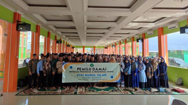 Ratusan mahasiswa dan civitas akademika Sekolah Tinggi Agama Islam (STAI) Nurul Islam, Mojokerto mendeklarasikan Pemilu 2024 damai dan bermartabat. Mereka juga sepakat menolak berbagai macam provokasi dan informasi bohong (hoax) agar pemilu berjalan aman, lancar dan kondusif.