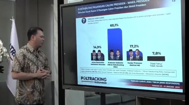 Dalam survei Poltracking di Jawa Timur, elektabilitas Prabowo-Gibran ada di angka 60,1%. Kemudian Ganjar Pranowo-Mahfud Md di angka 17,2%. Sementara Anies Baswedan-Muhaimin Iskandar di angka 14,9%.