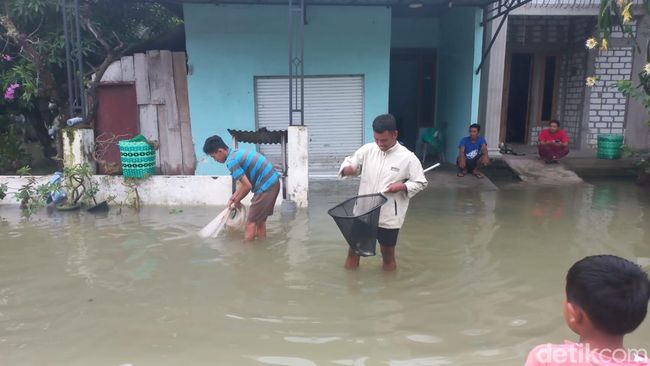 Sudah 2 hari ini Desa Tambakploso, Turi, Lamongan terendam banjir imbas jebolnya 2 tanggul Kali Plalangan. Meski aktivitas warga terganggu tetapi mereka menyikapi banjir itu justru dengan mencari ikan di depan rumah. Sementara anak-anak bermain perahu-perahuan.
