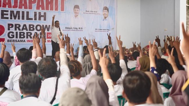 Ribuan generasi milenial Mojokerto Raya menyatakan dukungannya kepada Prabowo-Gibran. Dukungan ini dititipkan ke Ketua DPD Gerindra Jatim Anwar Sadad untuk diteruskan ke paslon 02.