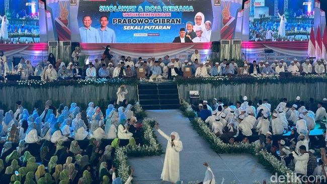 TKD Jatim 02 Prabowo Subianto-Gibran Rakabuming Raka menggelar selawat dan doa bersama di Jatim Expo, Surabaya. TKD Jatim menyebut acara ini dihadiri lebih dari 10 ribu relawan Prabowo-Gibran.