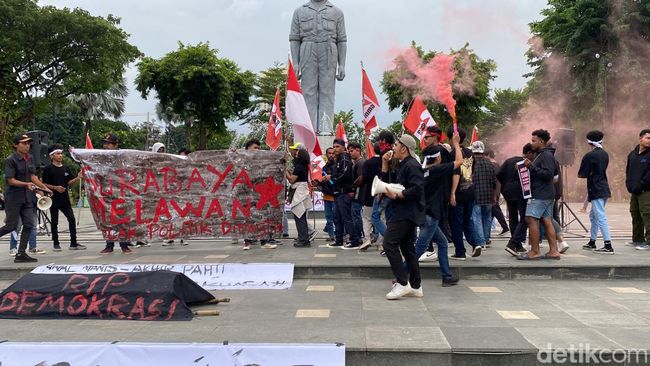 Untuk menyuarakan itu massa Gerakan Surabaya Melawan itu juga membentangkan sejumlah spanduk serta membawa sebuah keranda hitam sebagai simbol matinya demokrasi.