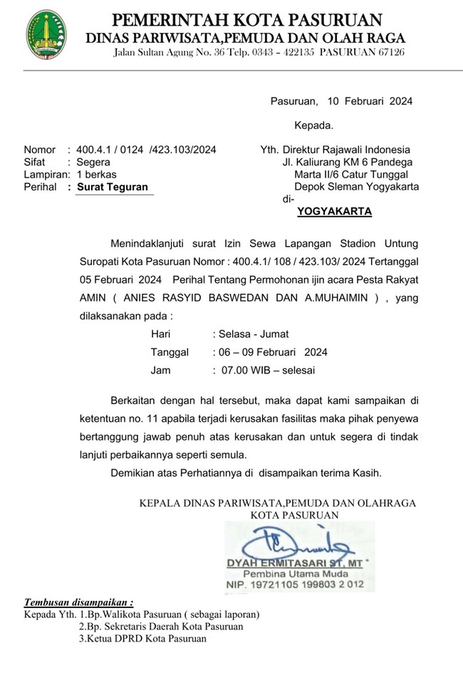 Surat teguran dilayangkan ke Direktur Rajawali Indonesia di Sleman, Yogyakarta, selaku pihak yang mengajukan izin dan sewa stadion untuk kepentingan kampanye akbar pada Jumat (9/2/2024).