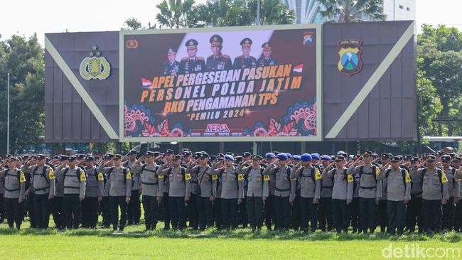 Polda Jatim menggelar apel terakhir pergeseran pasukan dalam rangka BKO ke wilayah-wilayah rawan untuk mengamankan Pemilu 2024. Ada 1.013 personel Polda Jatim yang BKO ke sejumlah polres yang membutuhkan penebalan pengamanan.