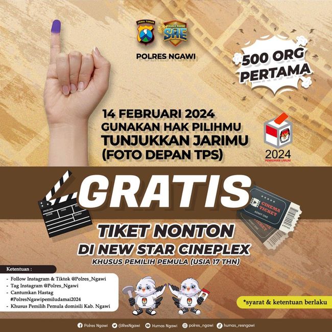 "Para pemilih pemula yang sudah menggunakan hak suaranya di TPS pada 14 Pebruari 2024 mendatang kita manjakan tiket gratis ke bioskop," ujar Kapolres Ngawi AKBP Argowiyono saat dikonfirmasi detikJatim, Senin (12/2/2024).