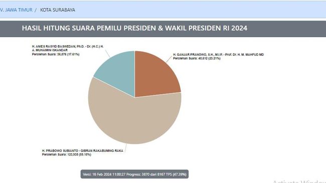Dilihat detikJatim di situs pemilu2024.kpu.go.id, Jumat (16/2/2024), data per pukul 11.00 WIB, jumlah suara di Surabaya yang sudah masuk sebanyak 3.870 dari 8.167 TPS atau sebesar 47.39%.