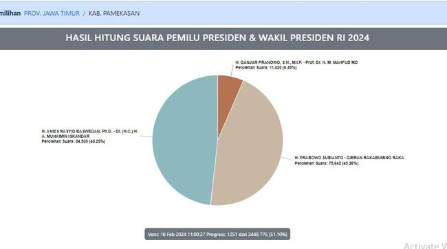 Paslon nomor urut 01 Anies-Cak Imin unggul sementara di Pamekasan Madura. Yakni 48,25% atau 84.900 suara. Hasil sementara ini dilihat di situs pemilu2024.kpu.go.id, Jumat (16/2/2024) per pukul 11.30 WIB.