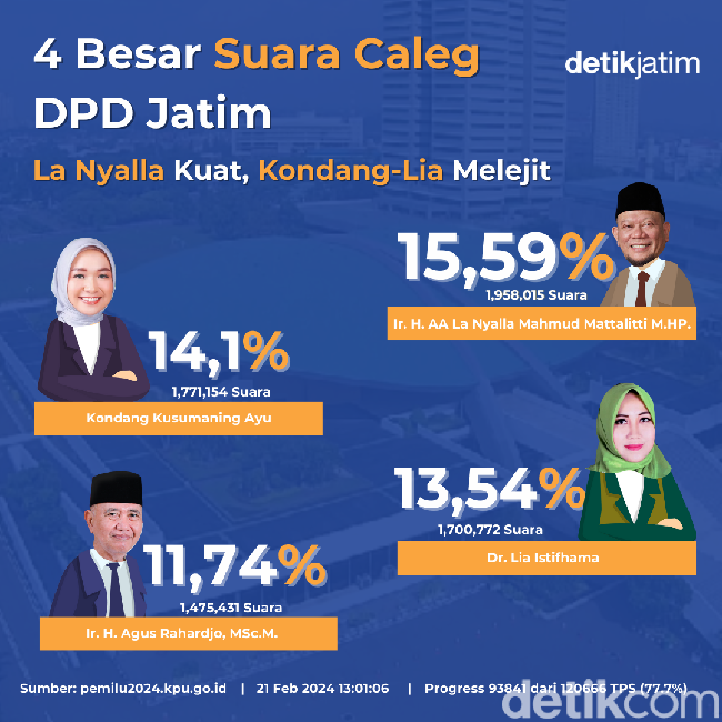 Kondang Kusumaning Ayu caleg DPD Jawa Timur yang belakangan viral dipilih karena paras cantiknya mendapatkan suara tinggi. Pantauan detikJatim hingga Rabu siang pukul 16.01 WIB, hasil real count sementara KPU menunjukkan Kondang telah meraih suara 14,09% atau 1.780.346 suara.