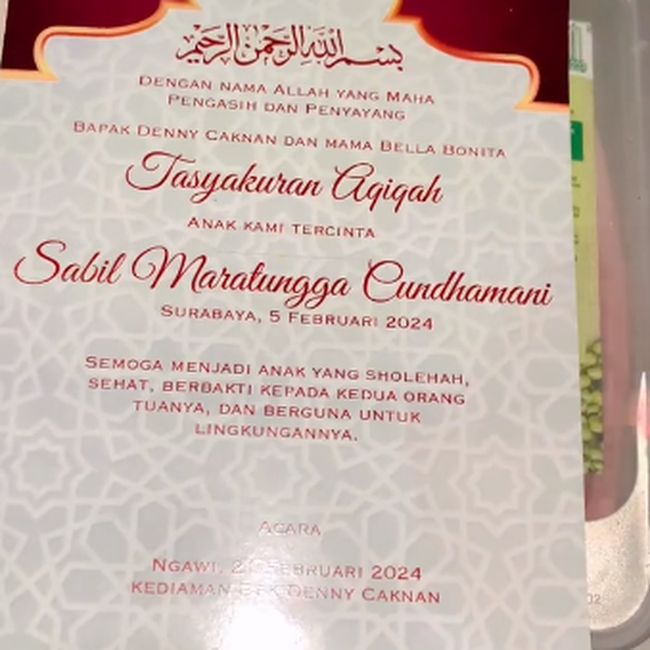 Video unboxing paket berkat dari acara akikah anak Denny Caknan tersebut diunggah akun TikTok @w.16_5. Di awal video tampak selembar kertas yang menjelaskan acara akikah tersebut.