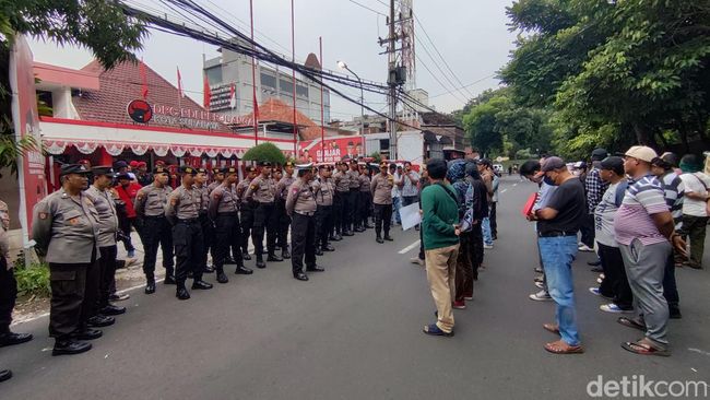Sejumlah massa pendemo memadati Kantor DPC PDI Perjuangan (PDIP) Surabaya. Mereka terlihat bergerak mendekat di Kantor DPC PDIP di Jalan Setail, Surabaya mulai pukul 16.45 WIB.