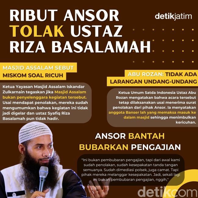 Keributan terjadi di Masjid Assalam, Perumahan Purimas, Gunung Anyar, Surabaya, Kamis (22/2) petang. Massa dari Gerakan Pemuda Ansor (GP) Ansor hingga Banser menolak pengajian yang menghadirkan Ustaz Syafiq Riza Basalamah. Imbas penolakan ini mengakibatkan terjadi salah paham antara pihak panitia penyelenggara pengajian dengan massa. Keduanya saling bersitegang hingga kericuhan pun tak terhindarkan. Kericuhan ini berbuntut panjang hingga GP Ansor melaporkan pihak panitia pengajian ke polisi usai 4 anggotanya mengalami luka.