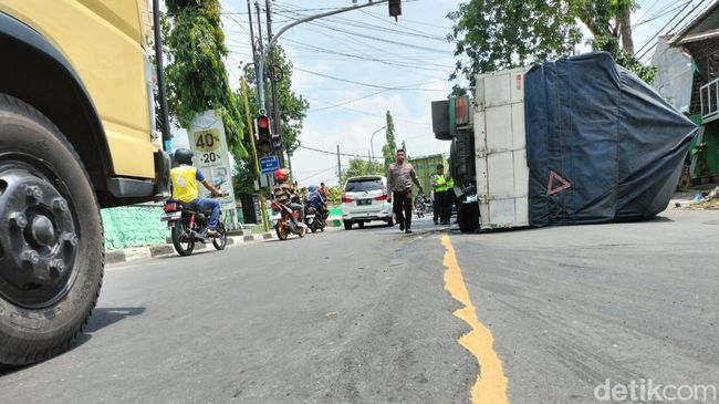Sebuah truk bermuatan permen 2,5 ton terguling di Jalan Raya Rajekwesi Kota Bojonegoro. Peristiwa itu terjadi saat sopir melintas di jalan bergelombang.