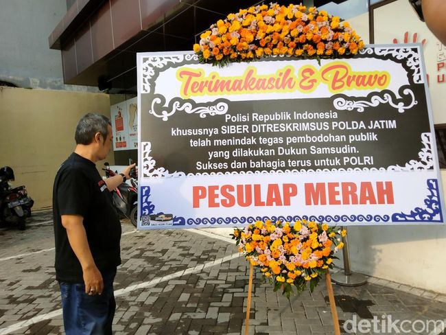 "Terimakasih dan Bravo kepada Polisi Republik Indonesia khususnya Siber Ditreskrimsus Polda Jatim telah menindak tegas pembodohan publik yang dilakukan Dukun Samsudin. Sukses dan bahagia terus untuk POLRI. Pesulap Merah," begitu narasi di karanangan bunga tersebut.