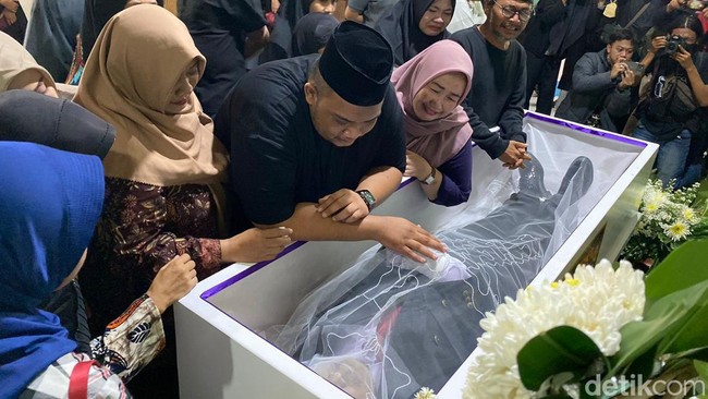 Sementara sang adik, Agung Cahyo Wibowo juga tampak tak kuasa menahan tangis. Suara tangisan Agung pecah saat peti jenazah dibuka.