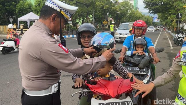 Sadar melanggar, Ruli berhenti. Petugas Satlantas Polres Pacitan tampak menghampiri. Tidak untuk menilang, melainkan memberi imbauan. Bahkan polisi memberi si anak helm untuk dipakai.