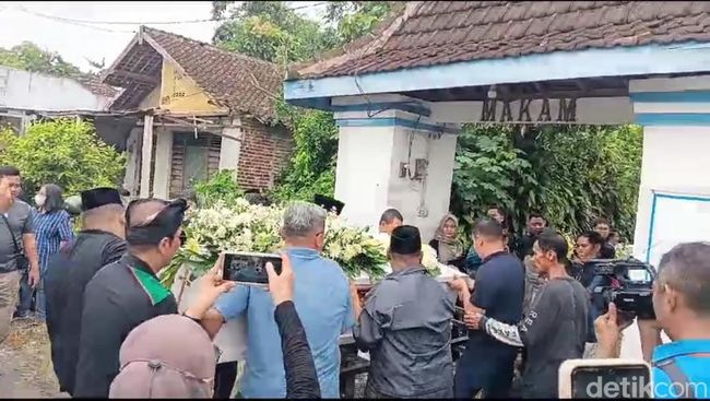Setelah itu, menggunakan ambulans, peti jenazah diantar ke TPU desa setempat yang berjarak sekitar 200 meter dari rumah duka. Isak tangis ketiga anak almarhum turut mengiringi pemberangkatan jenazah.