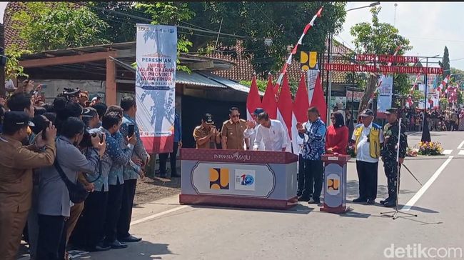 Selanjutnya,Jokowi pun meresmikan Inpres Jalan Daerah Provinsi Jatim ini. Jokowi menekan bel tanda diresmikannya Inpres Jalan Daerah Provinsi Jatim. Lalu, ia membubuhkan tanda tangannya.