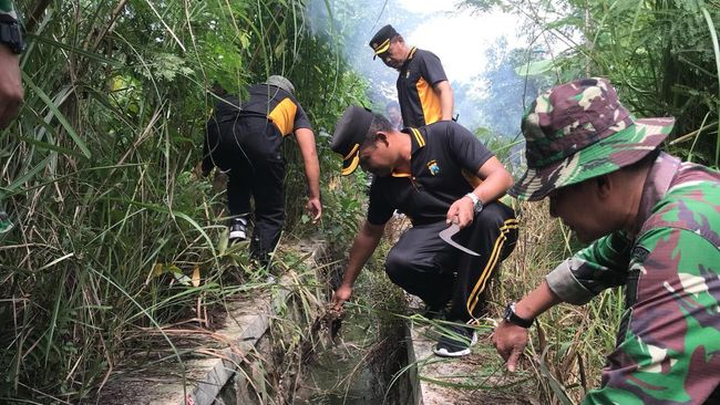 Polres Mojokerto Kota dan TNI kompak bekerja bakti membersihkan gorong-gorong dari sampah di Lingkungan Perumdam, Kelurahan Surodinawan, Prajurit Kulon. Kerja bakti ini untuk mencegah banjir kembali terjadi di wilayah ini.