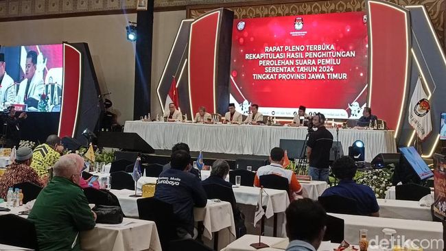 KPU Jatim telah menyelesaikan rapat pleno terbuka rekapitulasi hasil perhitungan tingkat provinsi pada Senin (11/3/2024), pukul 04.30 WIB. Paslon nomor urut 02 Prabowo Subianto dan Gibran Rakabuming Raka memenangkan suara di Jatim.