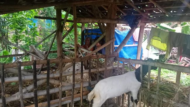 Kandang yang berisi 5 ekor kambing itu adalah titipan tetangga mereka. Jumeno bertugas merawat kambing-kambing itu.
