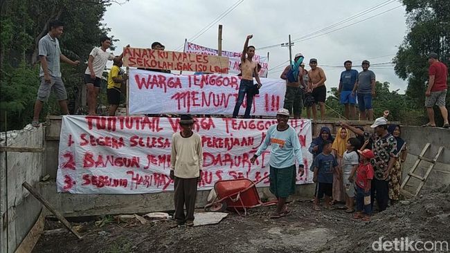 Ratusan warga Desa Tenggor, Balongpanggang, Gresik memprotes perbaikan jembatan penghubung antara Desa Tenggor-Desa Pacuh Kecamatan Balongpanggang, Gresik yang telah mangkrak selama 6 bulan. Mereka menuntut pembangunan jembatan segera diselesaikan.