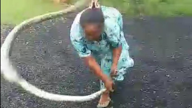 "Rajeh deh (besar deh)," jawab perempuan itu sembari masih membanting ular yang kepalanya dia cengkeram kuat.