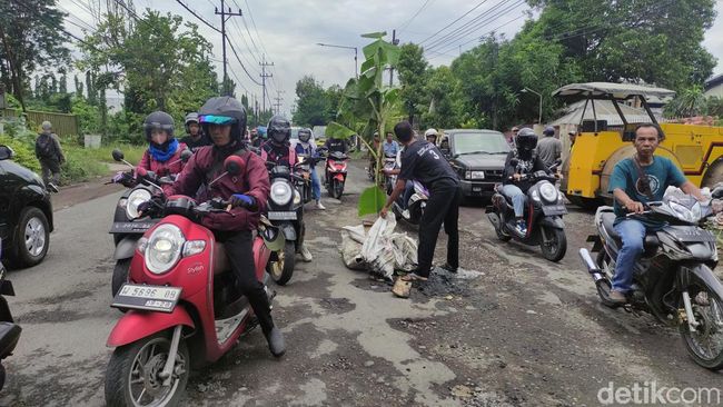 "Kita tanam pohon pisang di jalan ini, karena jalan yang rusak tak kunjung adanya perbaikan," kata Arip, salah satu warga Desa Kletek ditemui di lokasi, Senin (18/3/2024).