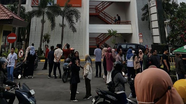 Pantauan detikJatim, Gedung Graha Petrokimia mengalami keretakan hingga bagian atas. Puluhan karyawan keluar menyelamatkan diri ke luar gedung.