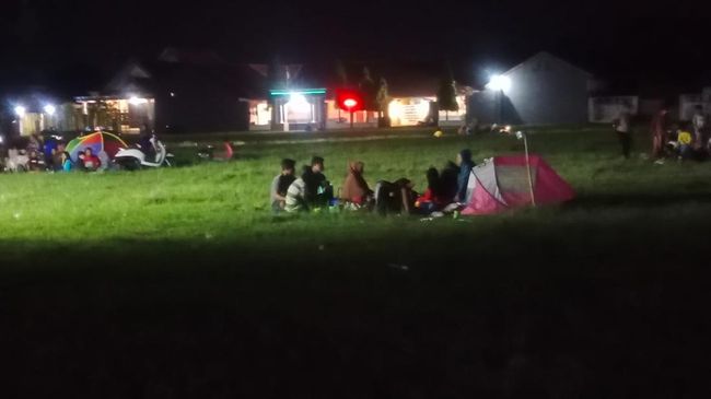 Takut gempa susulan, ratusan warga di Desa Tambak, Bawean, Gresik mengungsi ke lapangan. Warga itu mengungsi tanpa adanya tenda darurat maupun makan dan minuman.