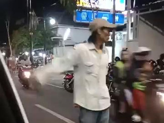 Video berdurasi 12 detik itu merekam seorang juru parkir tanpa seragam. Ia mengenakan celana jin, kemeja putih dan topi.