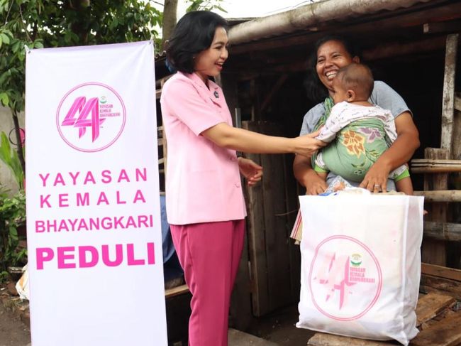 Yayasan Kemala Bhayangkari membagikan bantuan 150 paket sembako untuk menyambut hari ulang tahun mereka ke-44. Paket sembako tersebut dibagikan kepada para janda dan kaum duafa di Kota Mojokerto.
