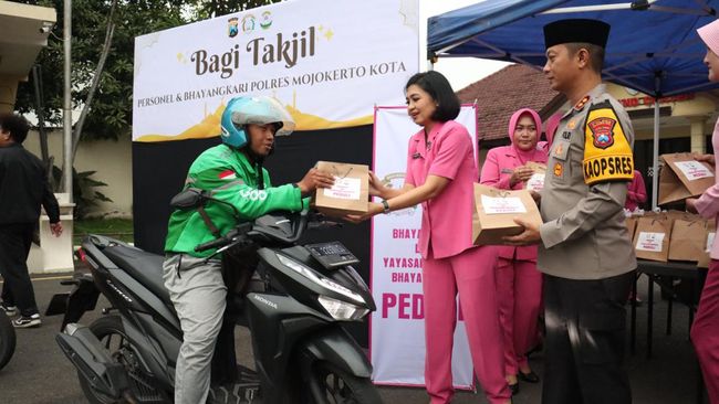 Aksi bagi takjil Polres Mojokerto Kota bersama ibu-ibu Bhayangkari membuat senang para pengguna jalan yang melintas di Jalan Bhayangkara. Mereka rela mengantre untuk mendapatkan takjil.