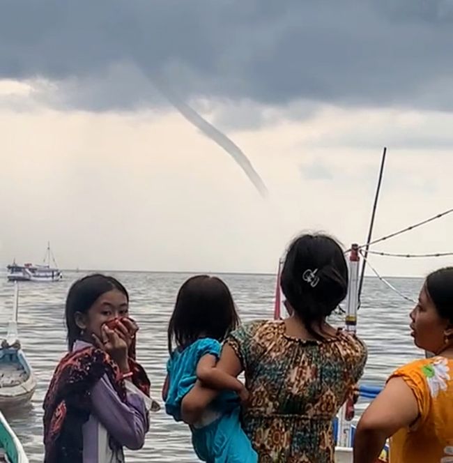 Dari video yang banyak direkam oleh warga sekitar, waterspout yang juga disebut belalai air tersebut tampak seperti kolom hitam tegak berdiri di atas permukaan laut.