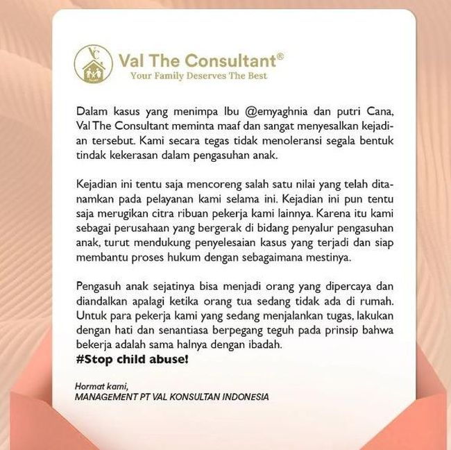 "Dalam kasus yang menimpa Ibu @emyaghnia dan putri Cana, Val The Consultant meminta maaf dan sangat menyesal atas kejadian tersebut. Kami secara tegas tidak menoleransi segala bentuk tindak kekerasan dalam pengasuhan anak.