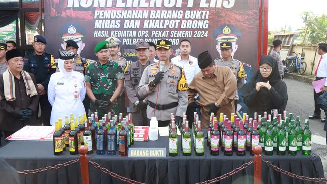 Sedangkan untuk barang bukti miras yang dimusnahkan yakni jenis arak 96 botol, tuak 49 botol, anggur kolesom 136 botol, miras pabrikan 74 botol, dan oplosan ada 1 botol.