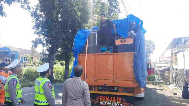 Pos pengamanan polisi di kecamatan Kalibaru menghadang sebuah truk fuso nopol P 9816 VG yang membawa muatan seperangkat soundsystem.