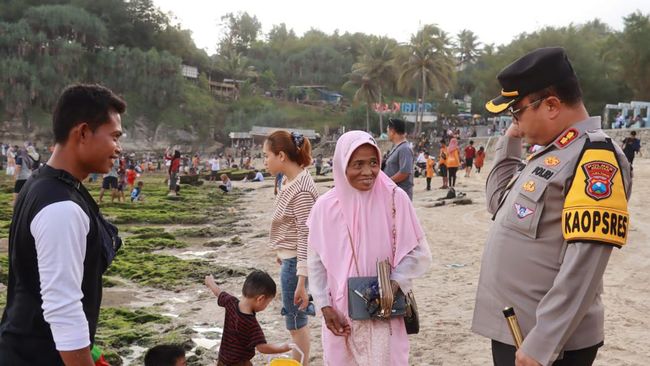 Usai berbincang dengan pengunjung, Kapolres lantas memantau beberapa titik lain. Seperti area berjualan, tempat parkir, hingga kawasan pantai yang kerap dijadikan tempat bermain wisatawan.